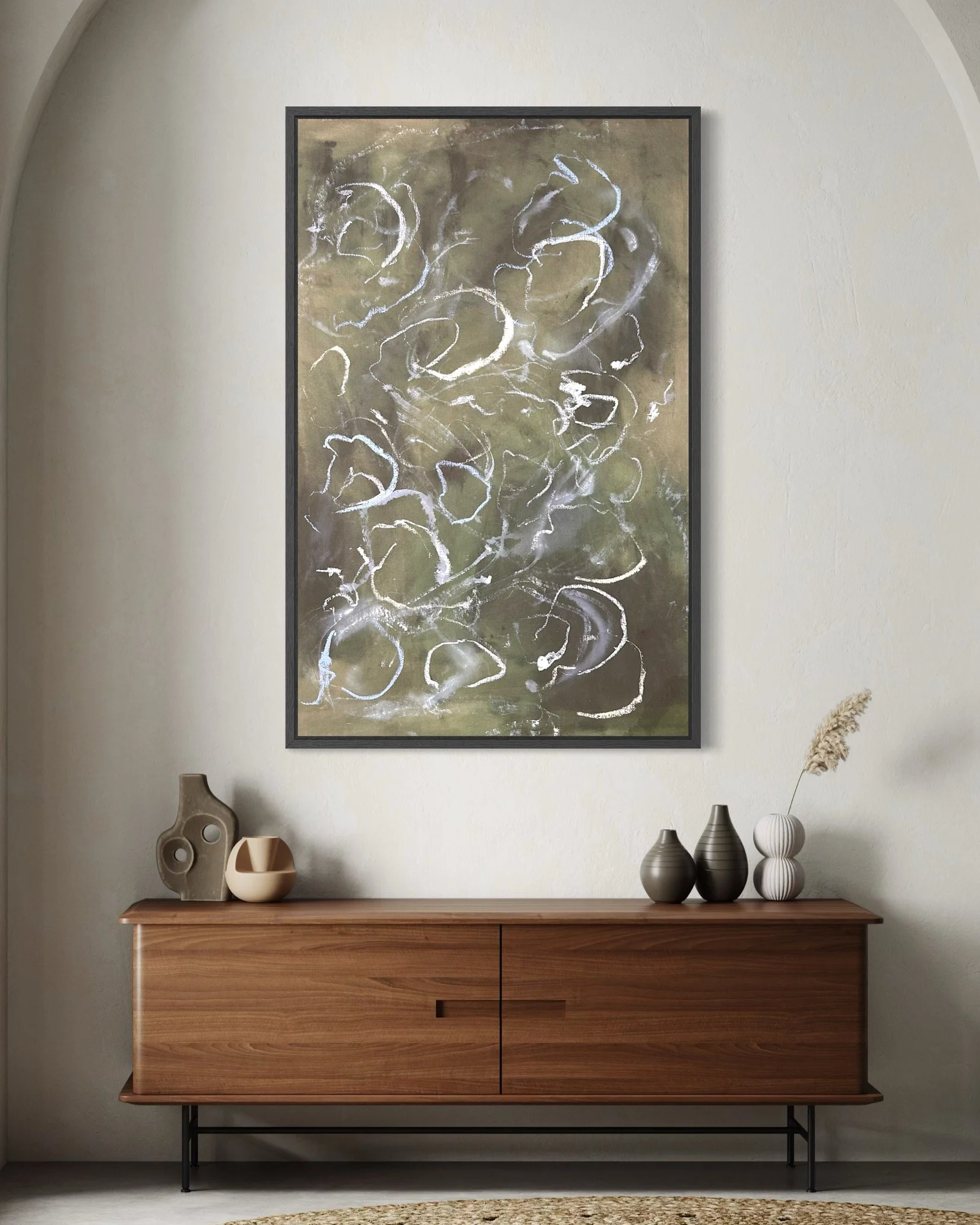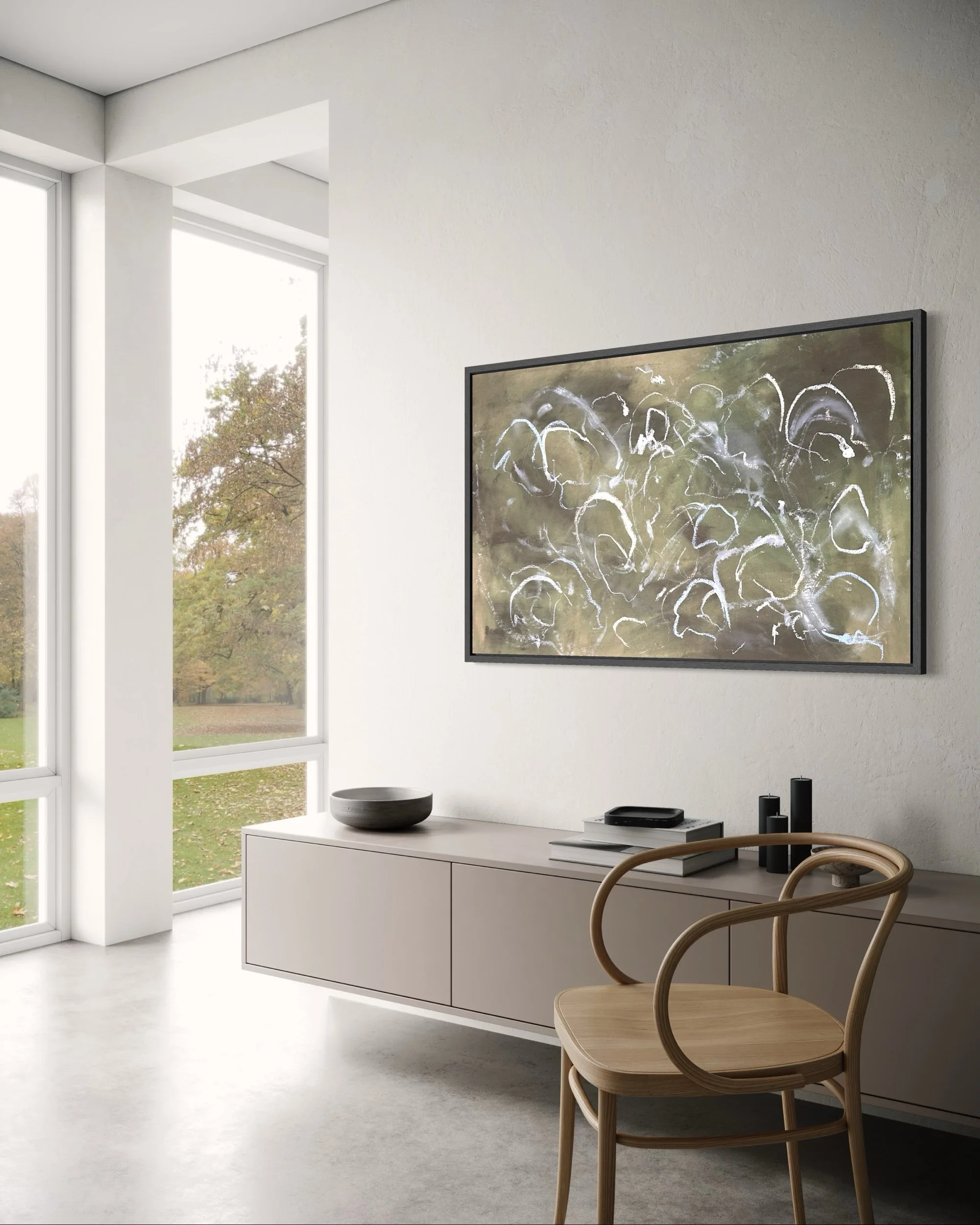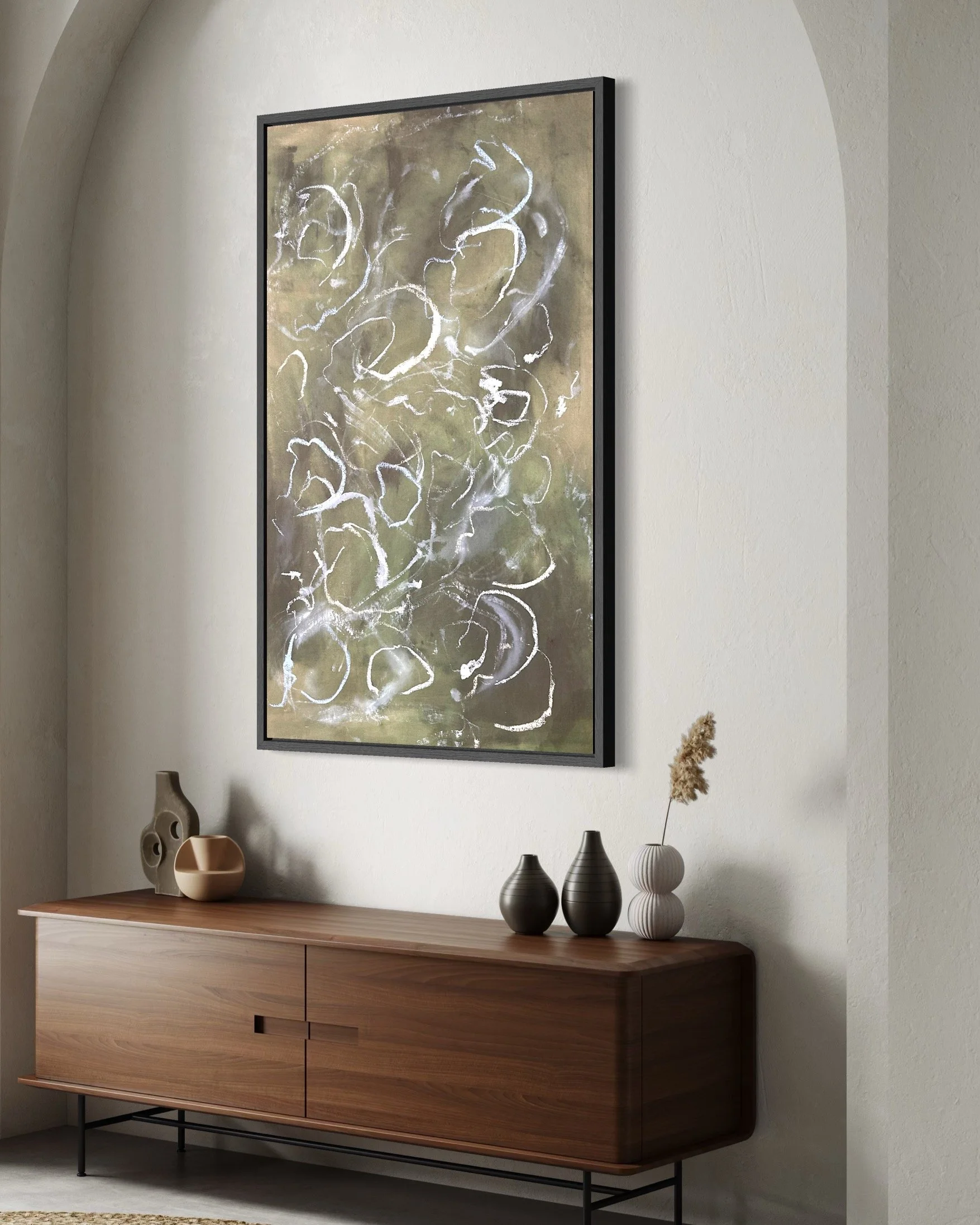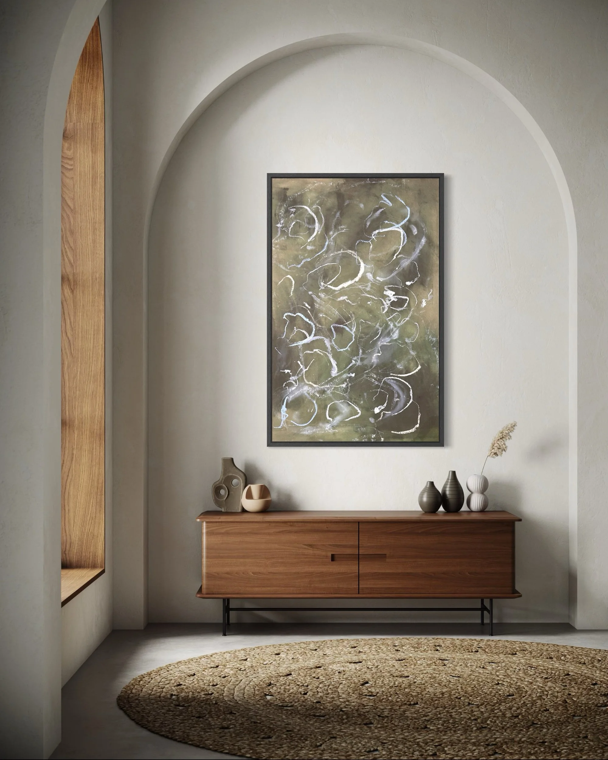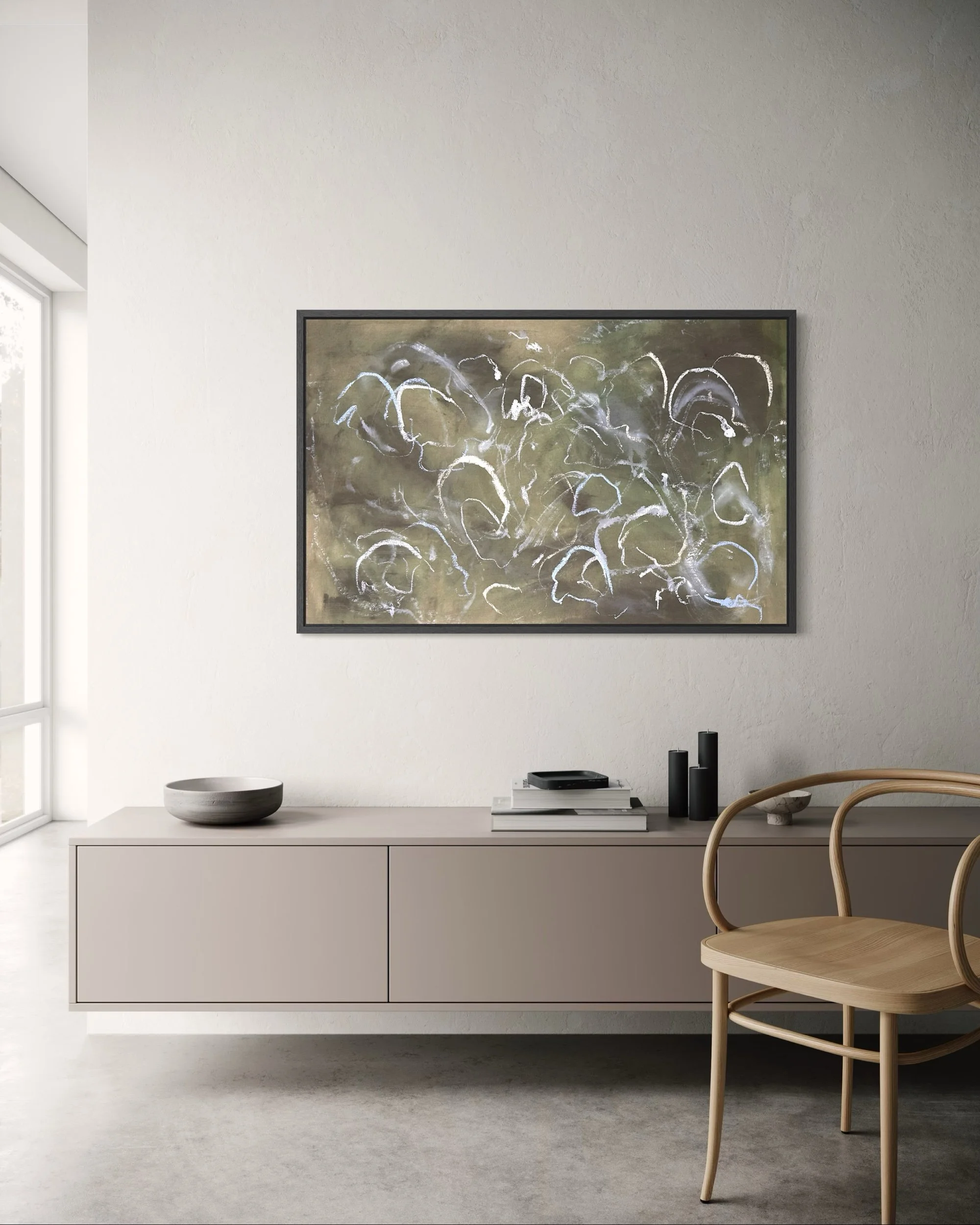 Acrylic and mixed media on raw canvas. This piece can either be displayed in glass at 48×36 dimensions or can be stretched into 40×24 dimensions. Price would vary accordingly.