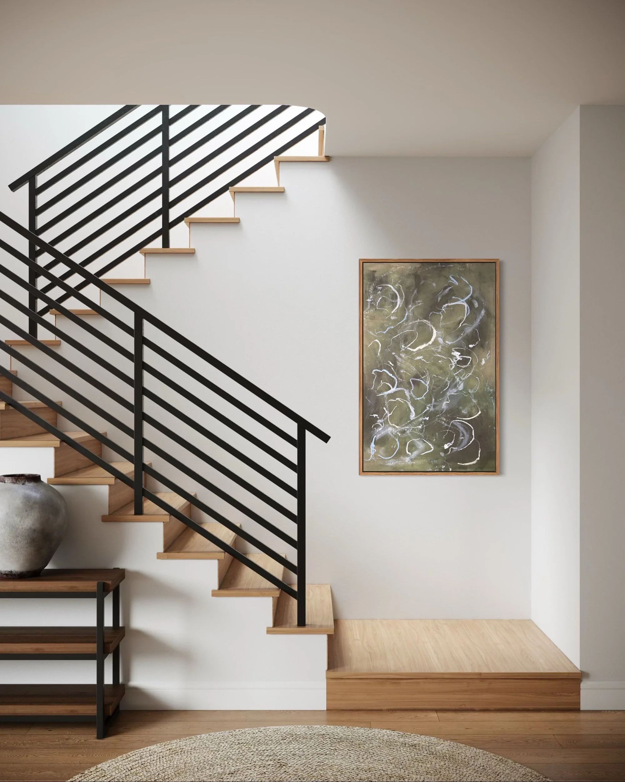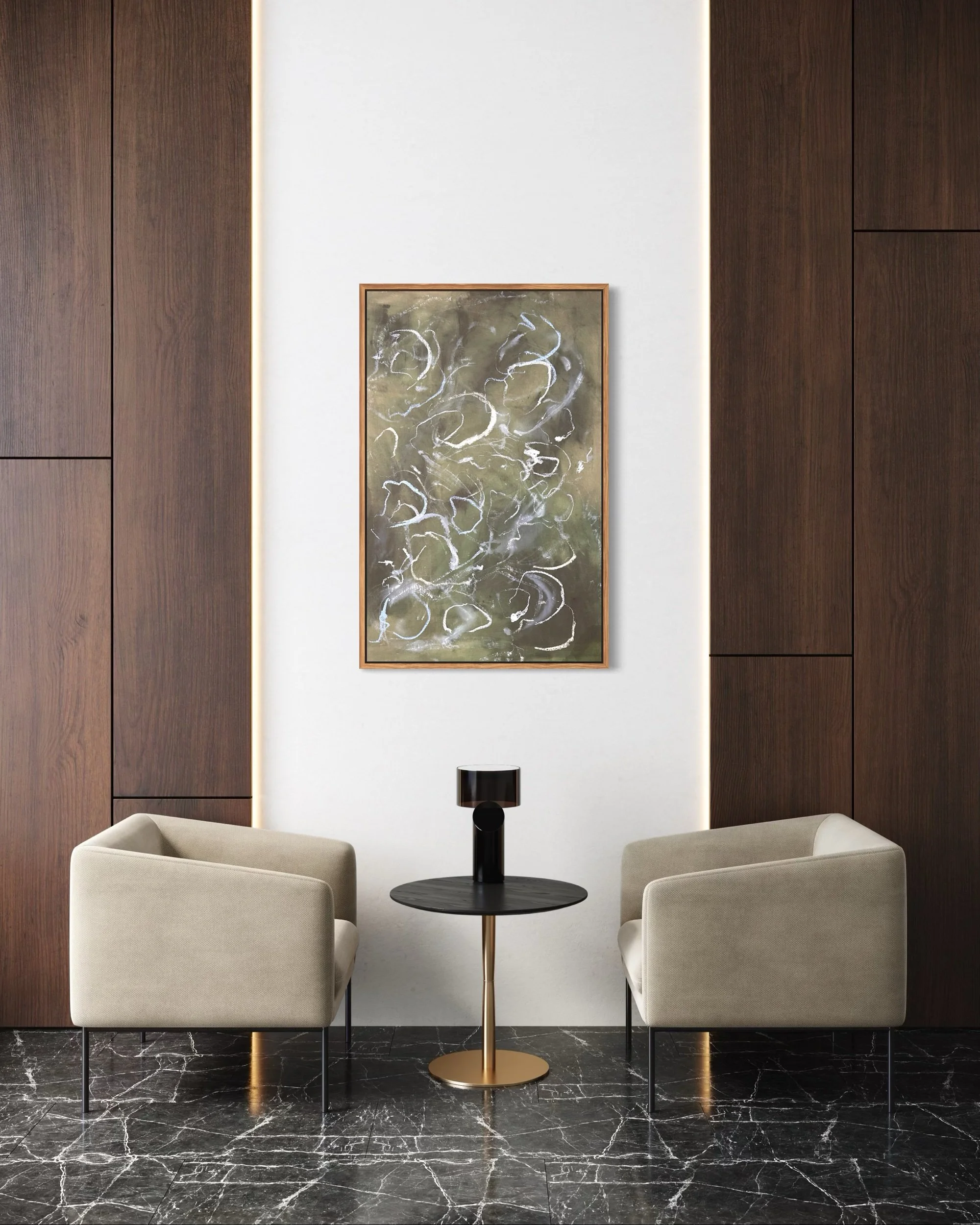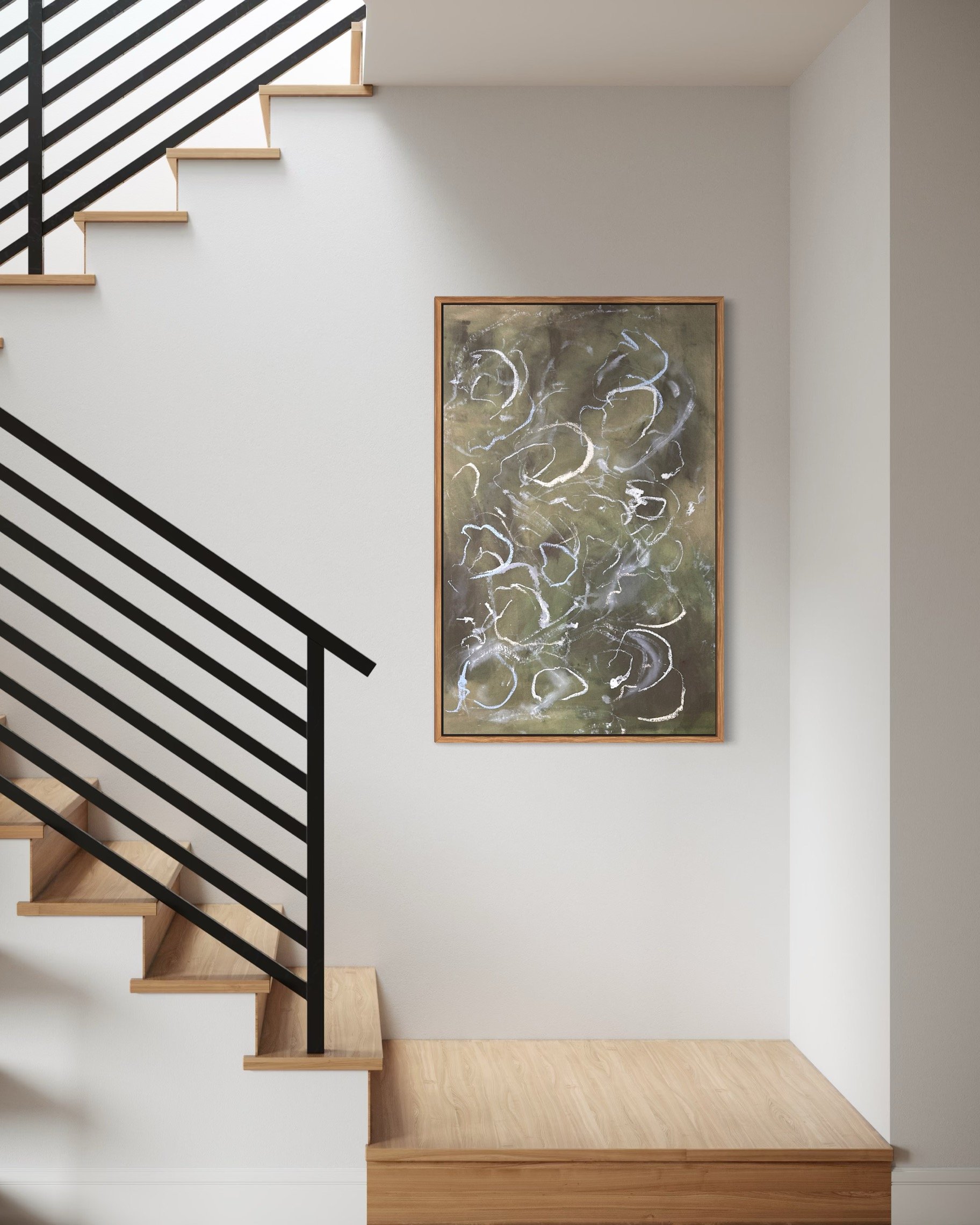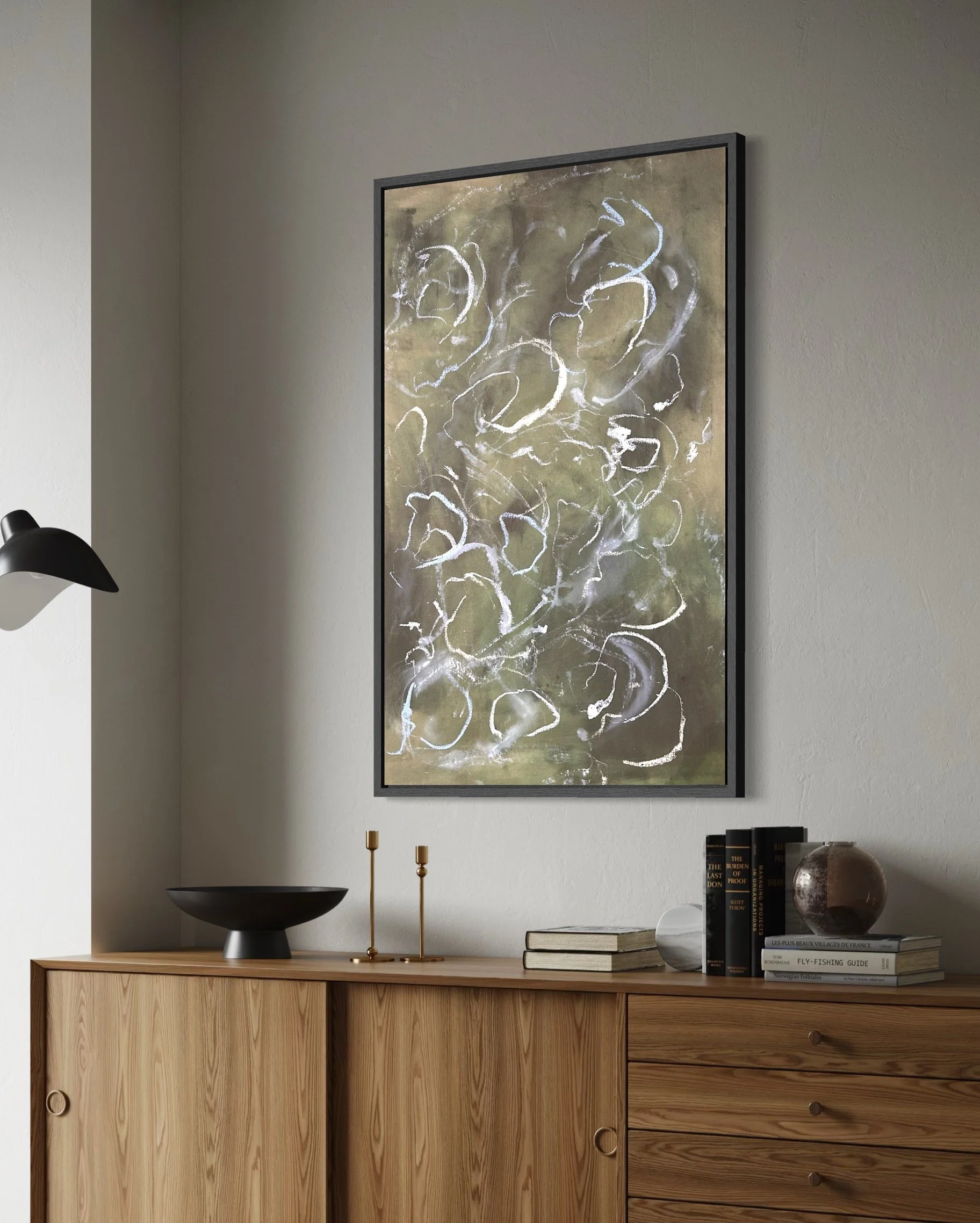 Acrylic and mixed media on raw canvas. This piece can either be displayed in glass at 48×36 dimensions or can be stretched into 40×24 dimensions. Price would vary accordingly.
