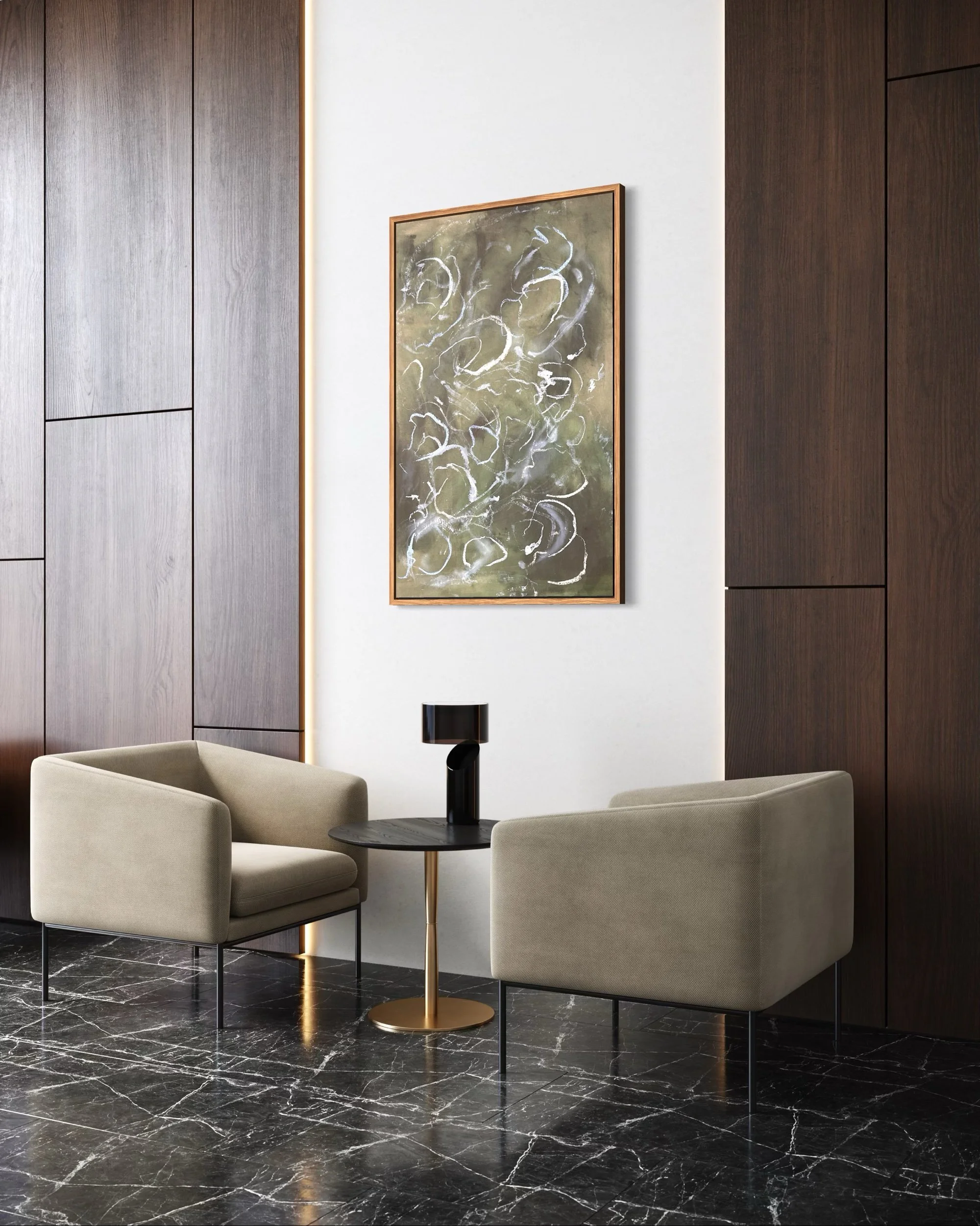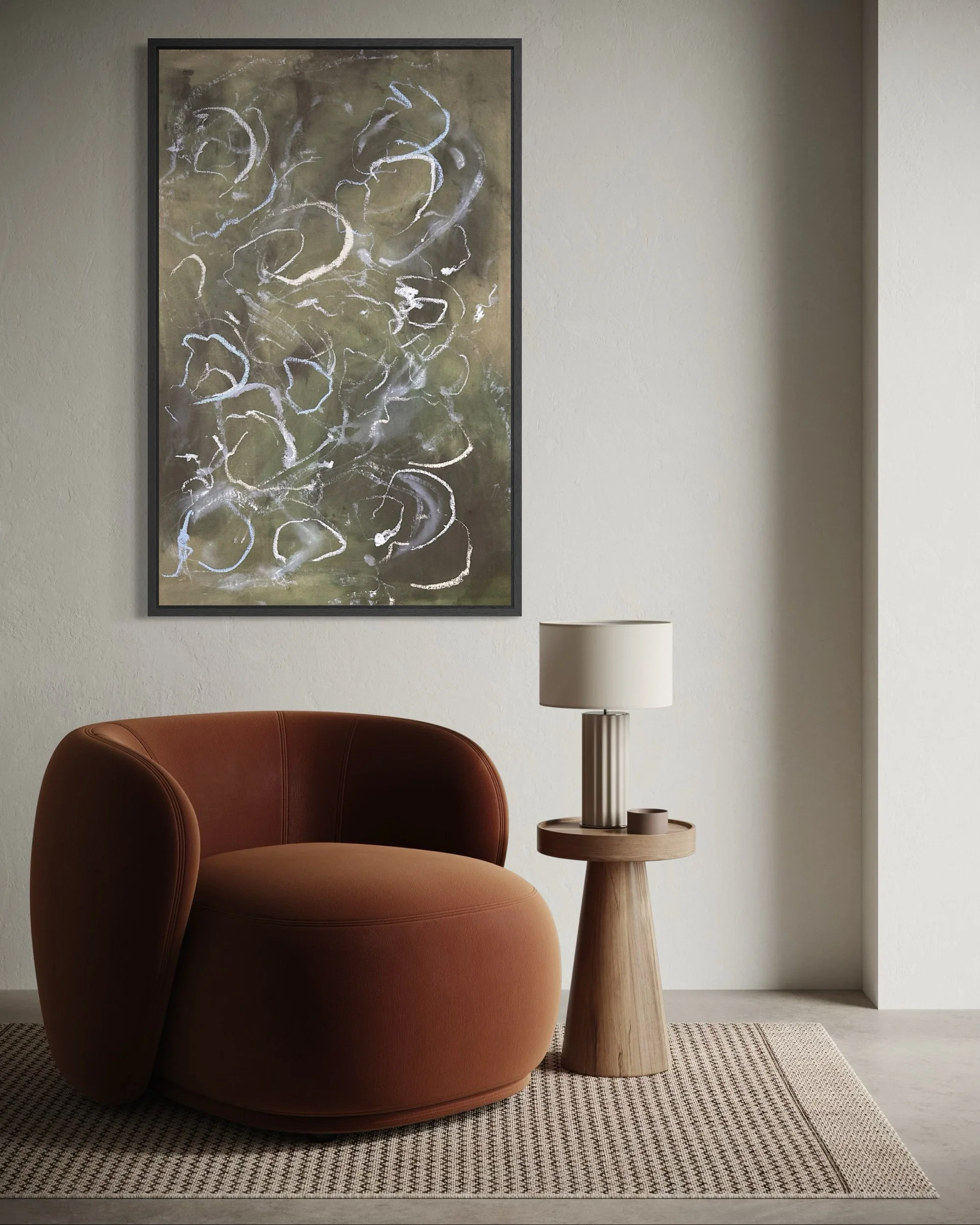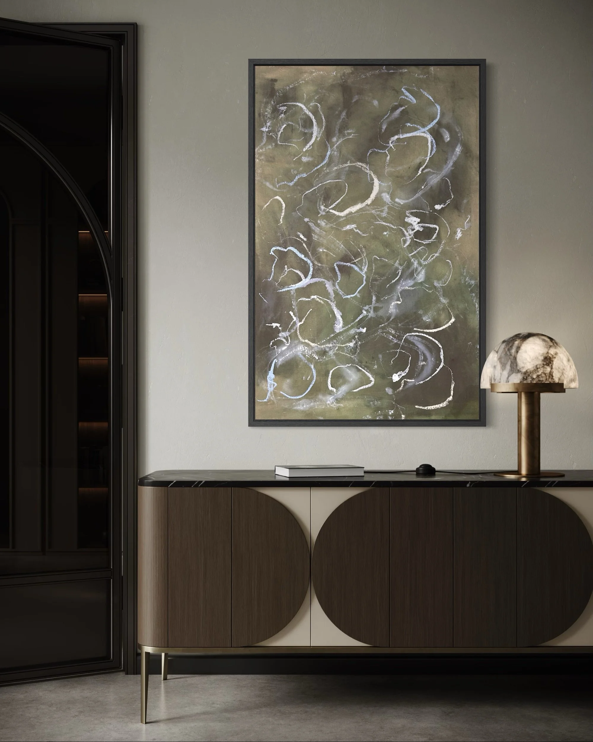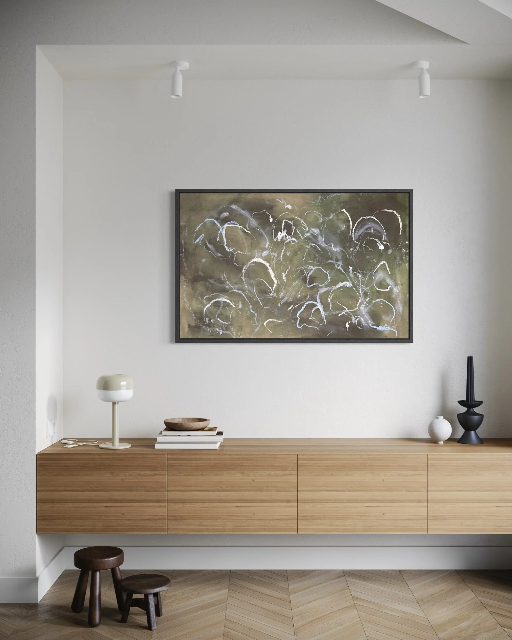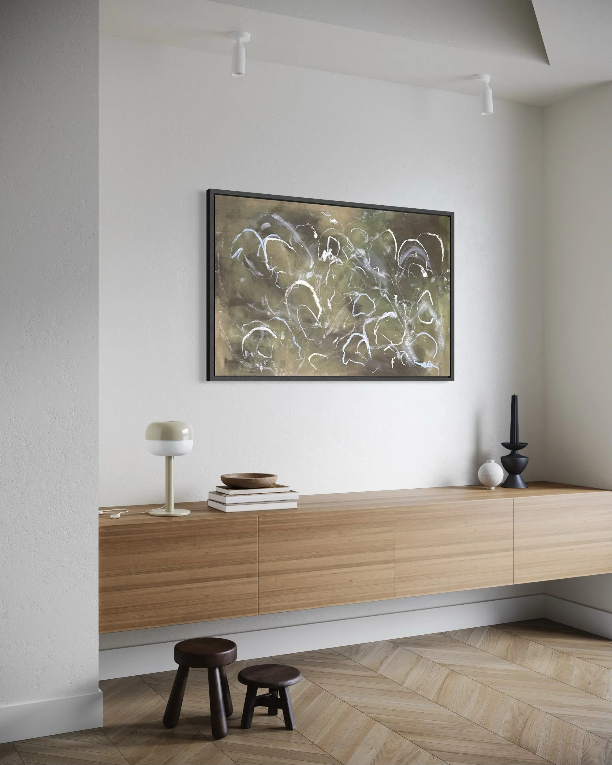 Acrylic and mixed media on raw canvas. This piece can either be displayed in glass at 48×36 dimensions or can be stretched into 40×24 dimensions. Price would vary accordingly.