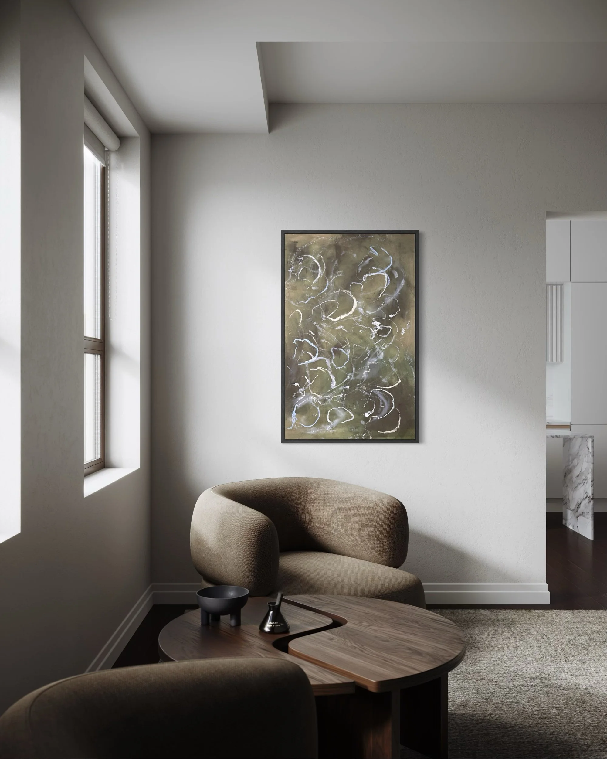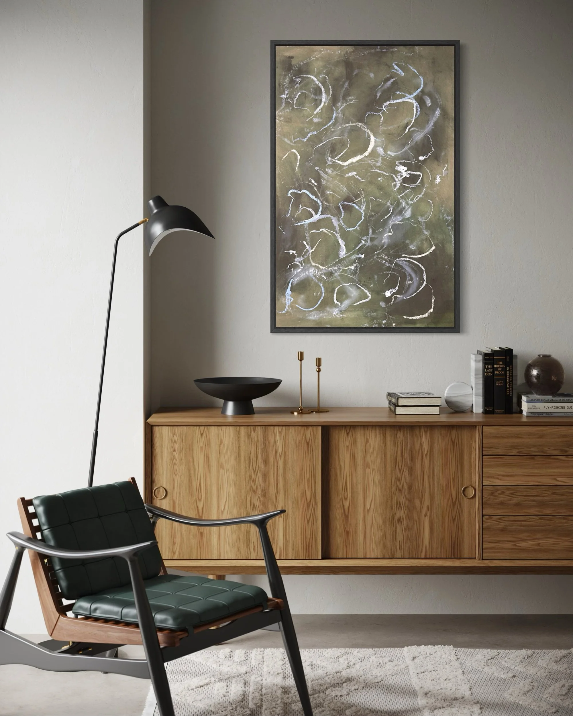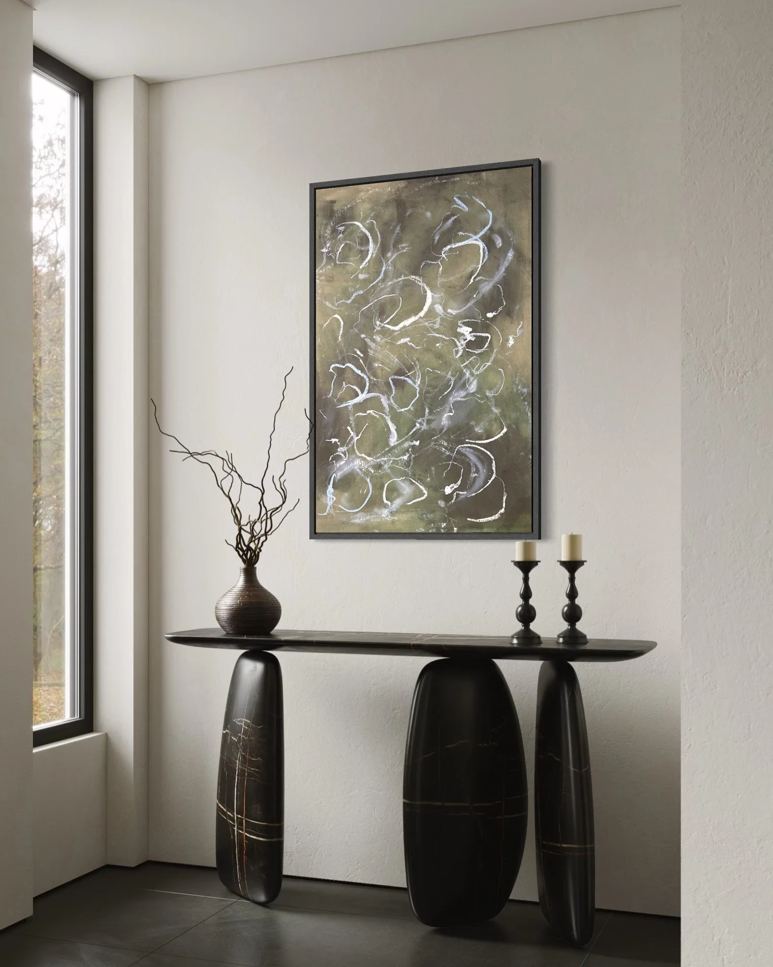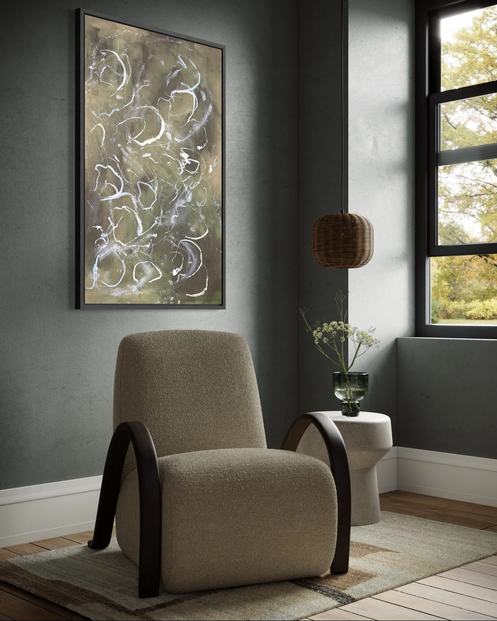 Acrylic and mixed media on raw canvas. This piece can either be displayed in glass at 48×36 dimensions or can be stretched into 40×24 dimensions. Price would vary accordingly.