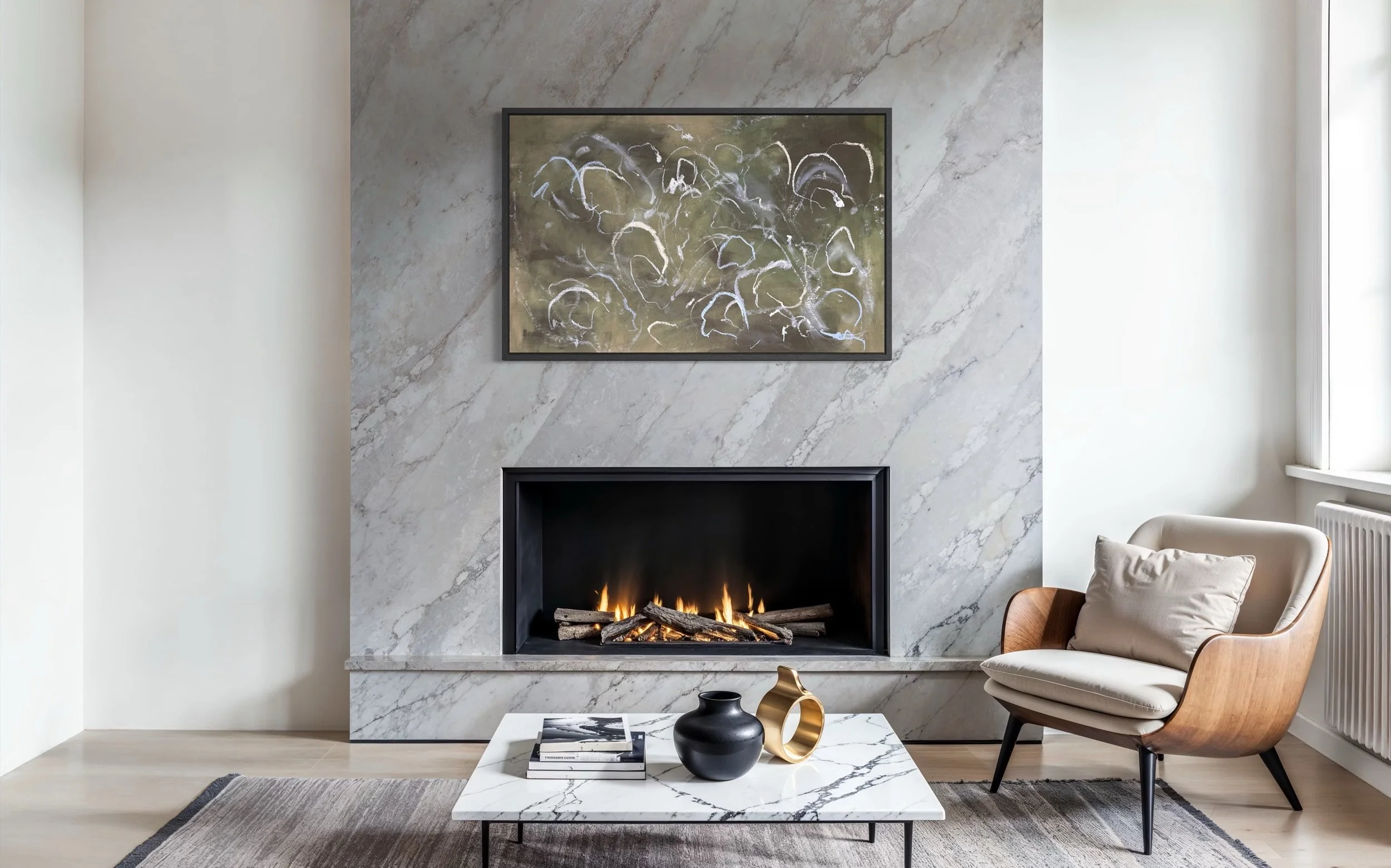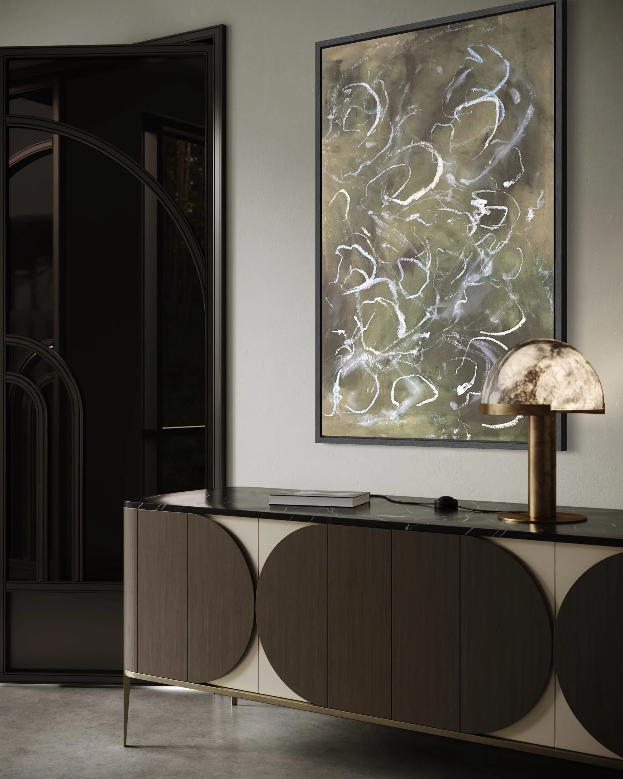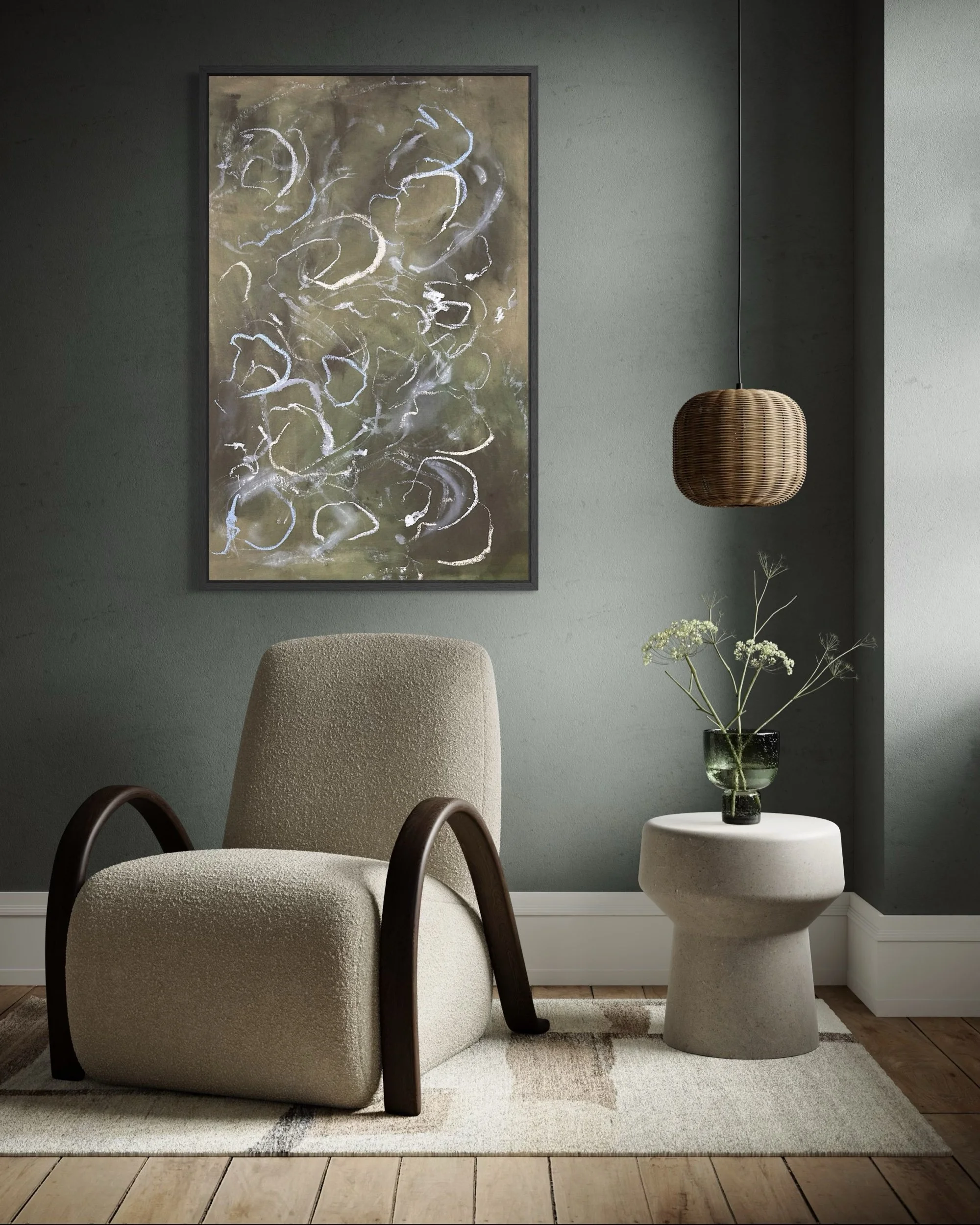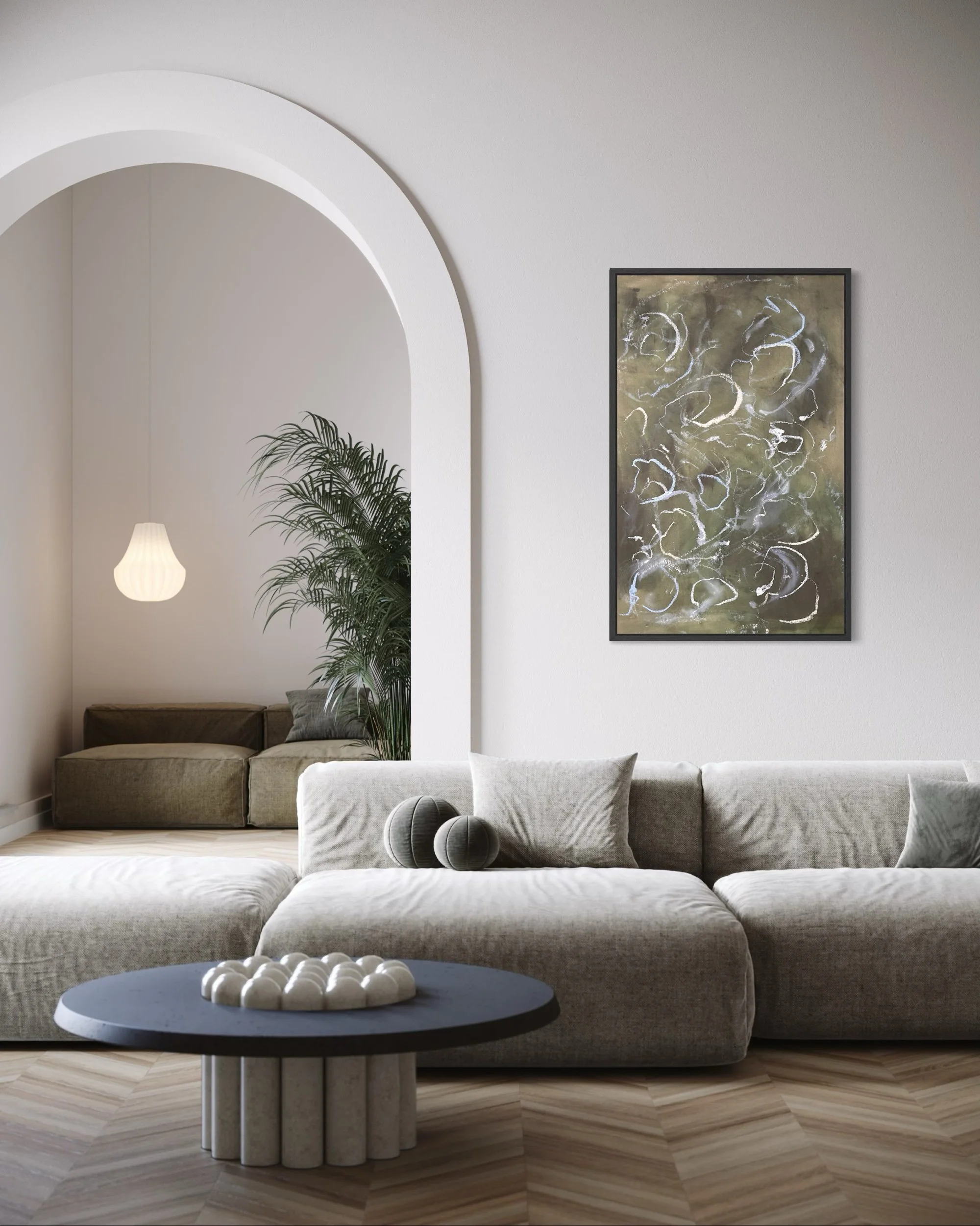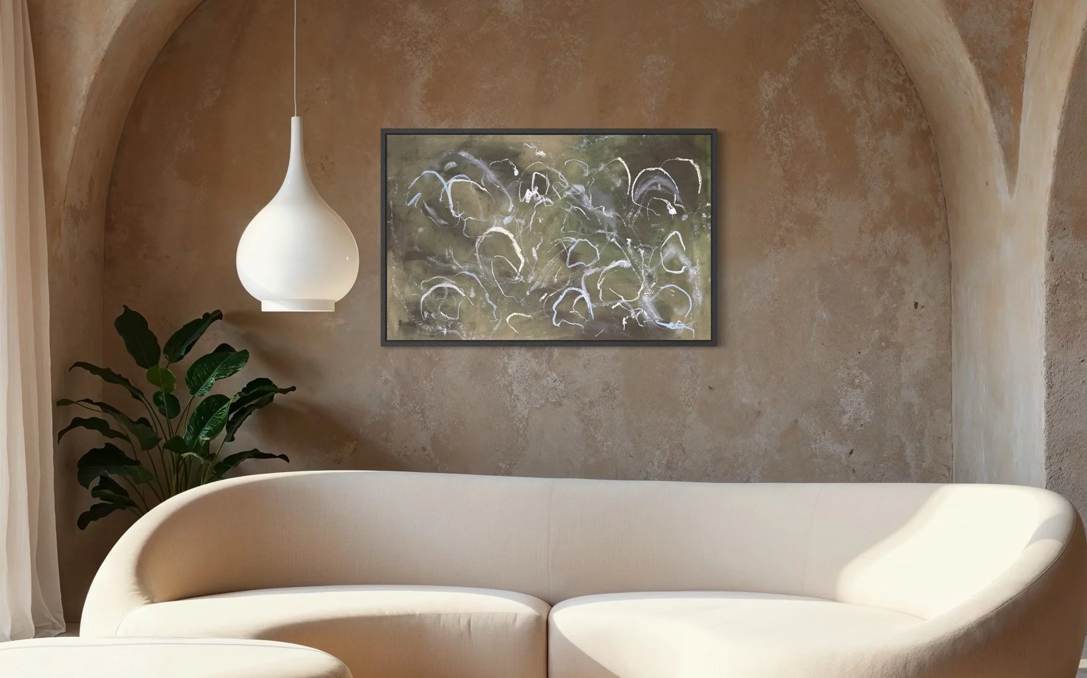 Acrylic and mixed media on raw canvas. This piece can either be displayed in glass at 48×36 dimensions or can be stretched into 40×24 dimensions. Price would vary accordingly.